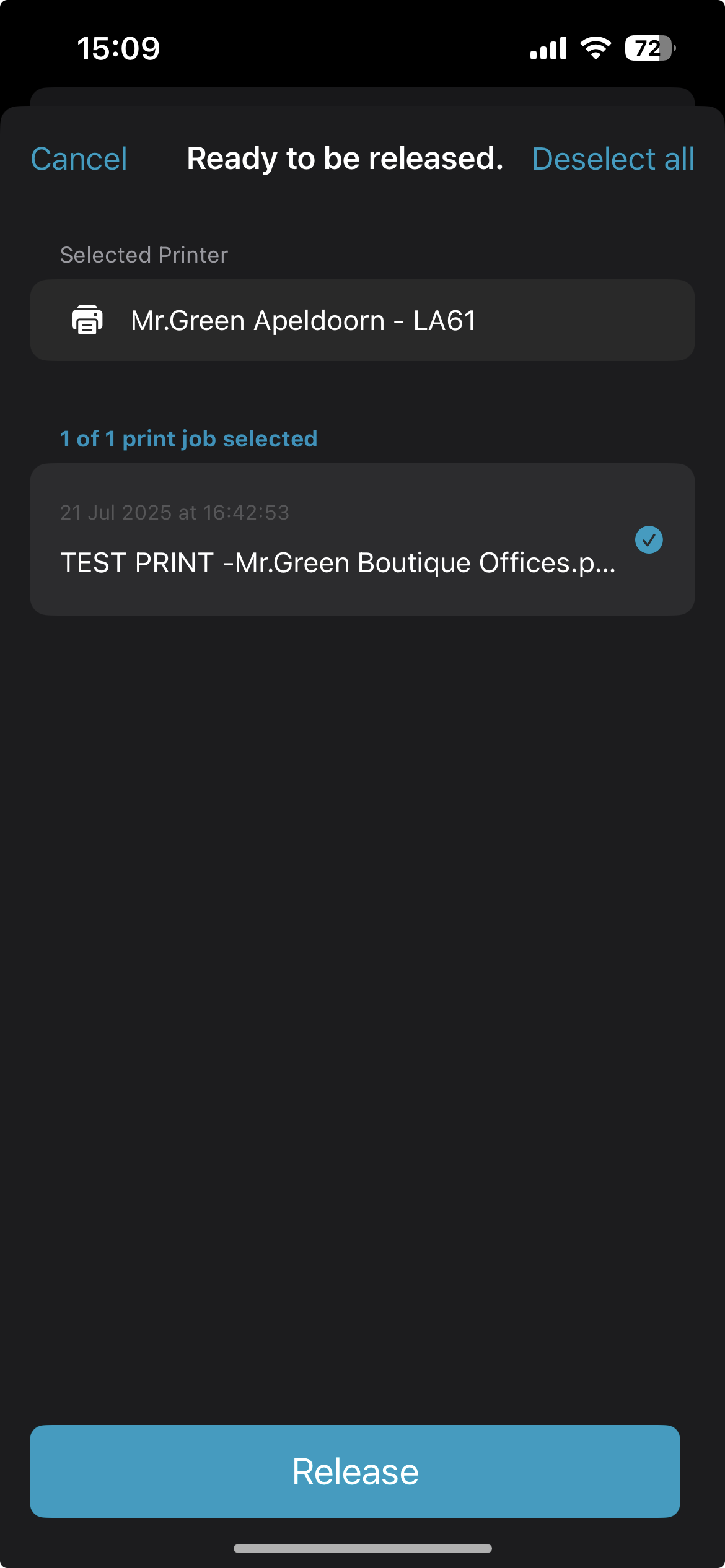 - Select the print jobs and click 'Release'.