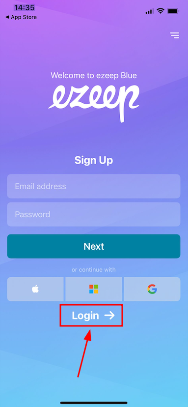 Bij de eerste keer openen van de eZeep Blue App nodigt de app je uit om je gegevens in te vullen bij Sign Up. Selecteer de optie om met je Microsoft, Google of Apple account in te loggen. Klik hiervoor het desbetreffende icoontje. Wil je dit niet, gebruik dan de Login knop om een account te maken.